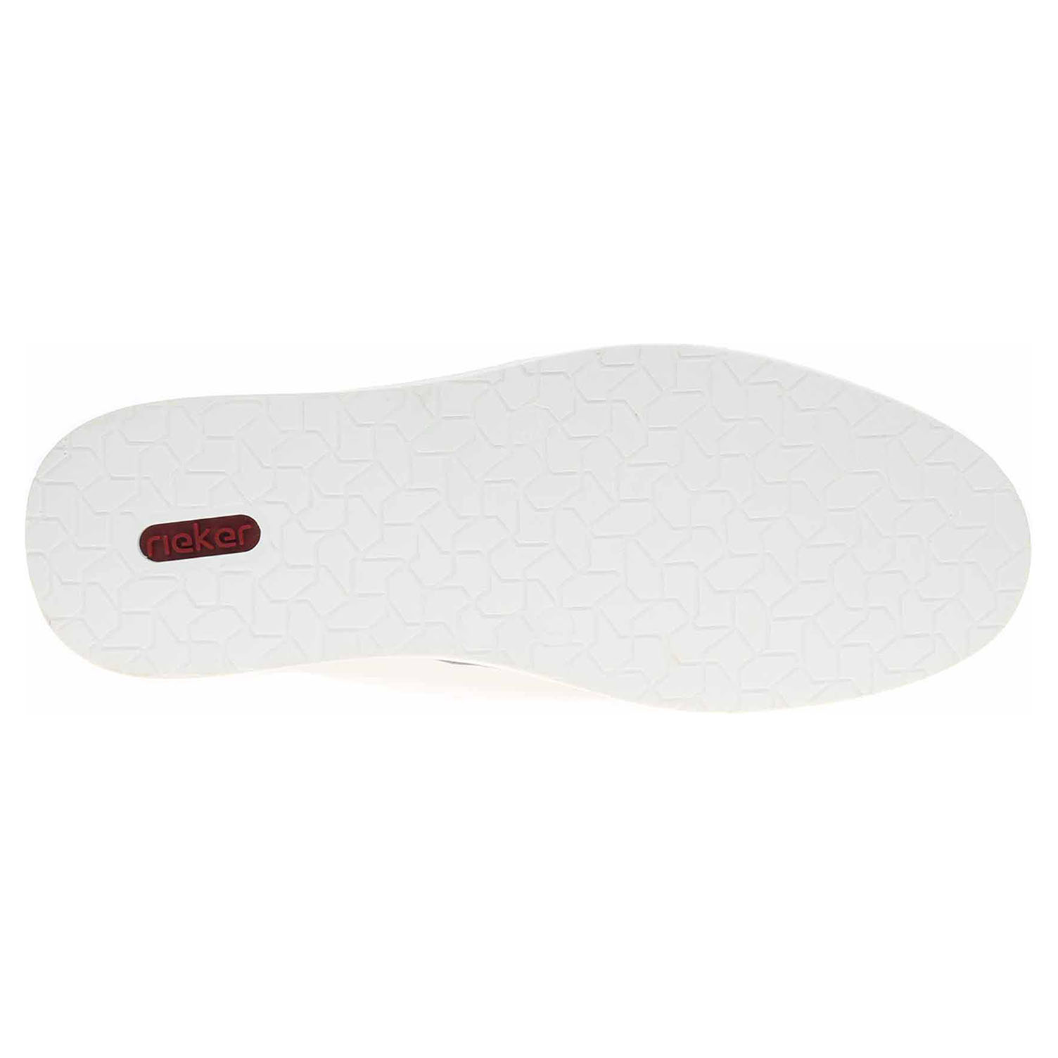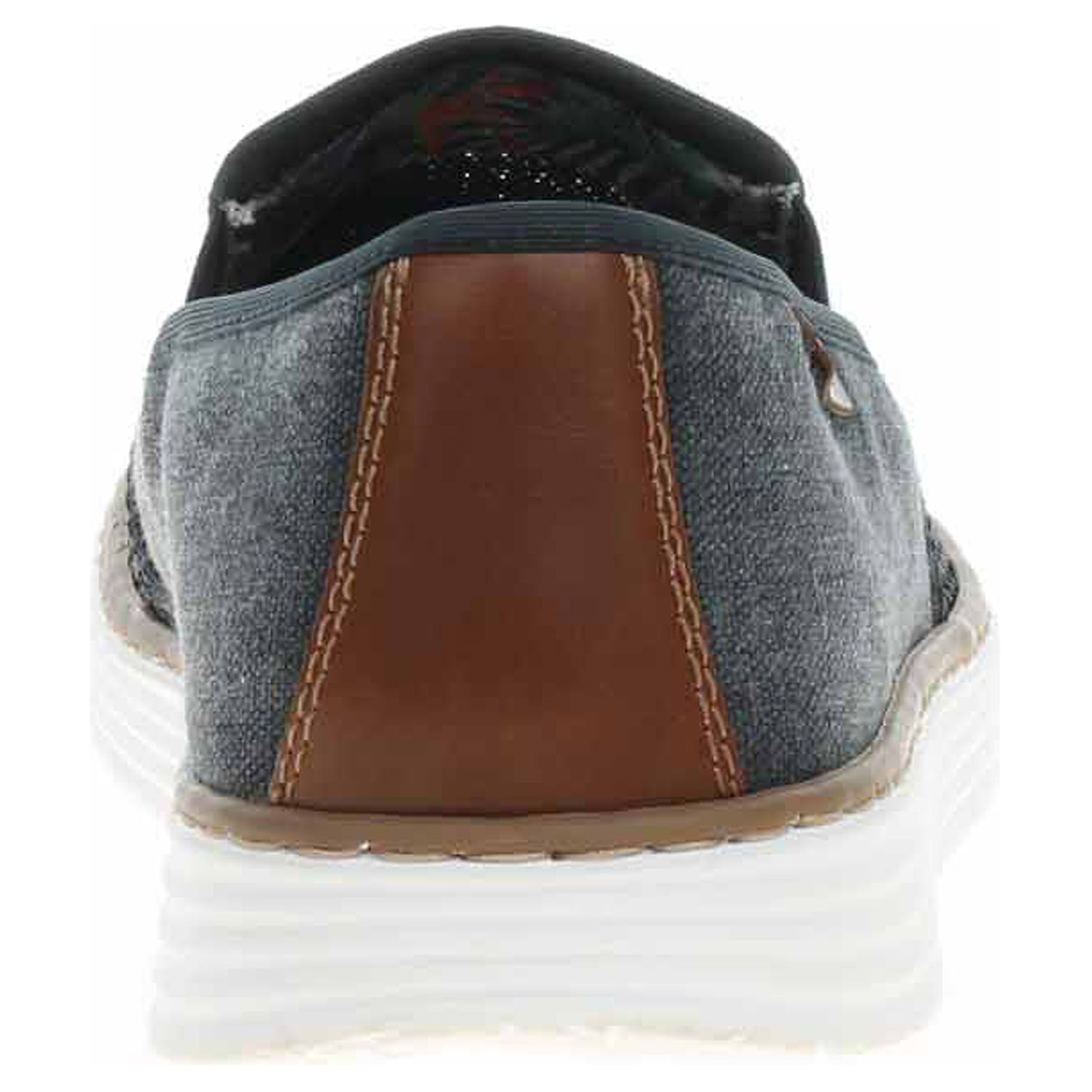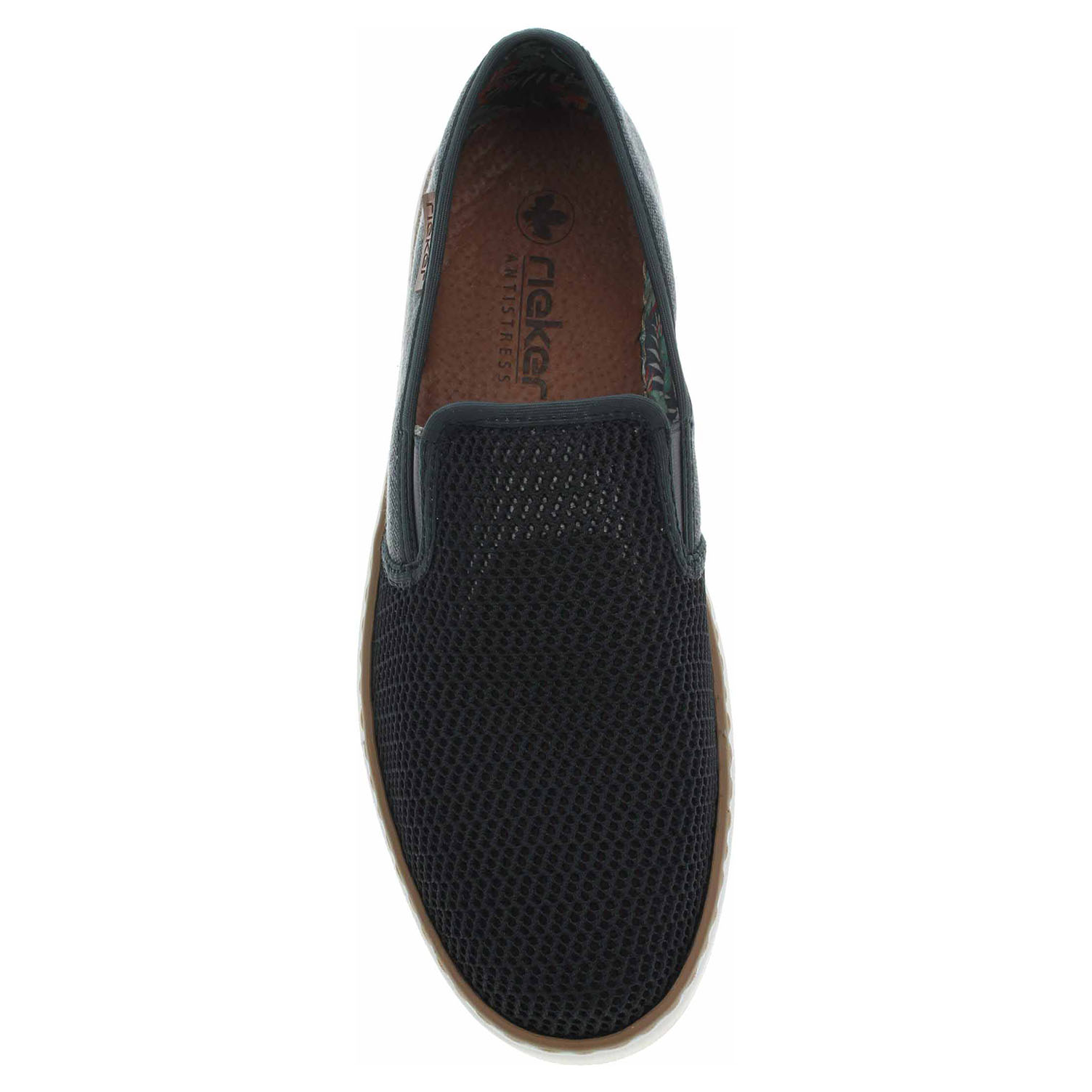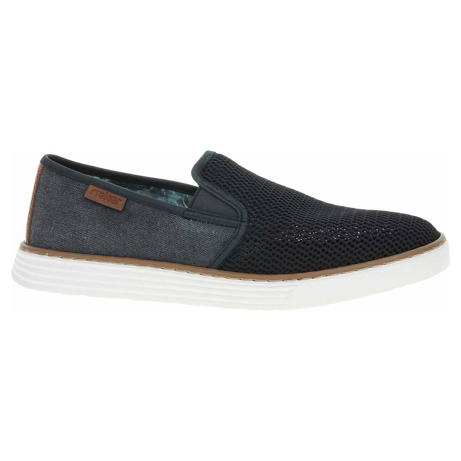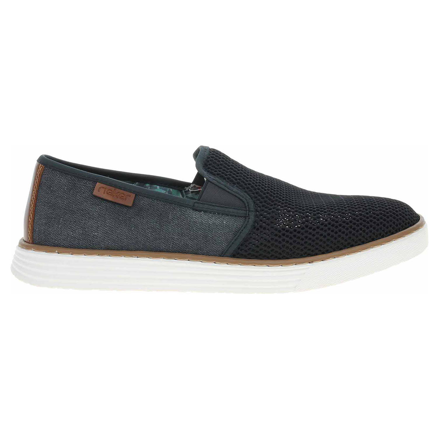 Boty Rieker - textilní pánské mokasiny se svrškem kombinovaným textil/syntetika a s textilní podšívkou jsou vybavené vyměkčenou stélkou s nášlapnou vrstvou z usně a na vnitřní i vnější straně nártu vsazenými gumičkami, které zajišťují pohodlné nazouvání. Podešev je flexibilní a díky systému Antistress skvěle tlumí nárazy a otřesy. Textilní obuv - nepoužívejte ve vlhkém prostředí. Ošetřujte za sucha kartáčováním a impregnací.