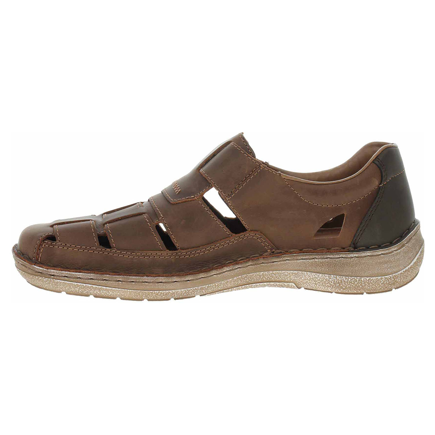 Boty Rieker - flexiblové pánské uzavřené sandály nadměrné šíře mají svršek i stélku z usně a podšívku ze syntetiky. Pásek přes nárt se zapíná na suchý zip a zajišťuje pohodlné nazouvání. Klínek je vysoký 3,- cm. Podešev je flexibilní a díky systému Antistress (lehkost, pružnost, prostornost a vynikající absorpce nárazů) Vám obuv zajistí pohodlí při každém kroku. Flexiblová obuv - prošívaná podešev, obuv používejte v suchém prostředí. Při zvýšené vlhkosti může dojít k promáčení obuvi. Obuv pravidelně impregnujte nebo krémujte, zvláště pak prošívaný okraj.