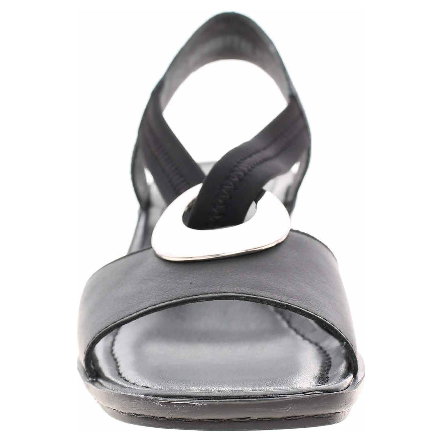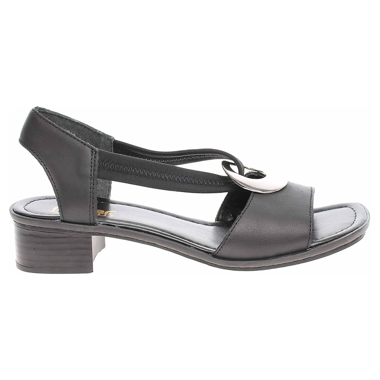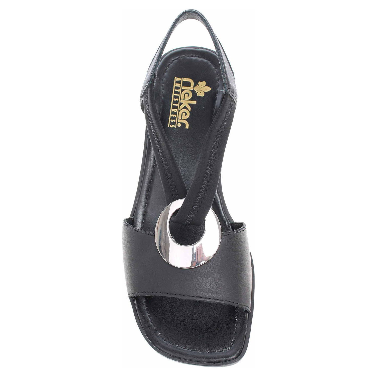 Boty Rieker - dámské sandály na podpatku vysokém 3,- cm. Svršek je kombinovaný kůže/syntetika. Pro pohodlné nazouvání je ozdobným kroužkem přes nárt provlečená gumička. Podešev je flexibilní a díky systému Antistress skvěle tlumí nárazy a otřesy.