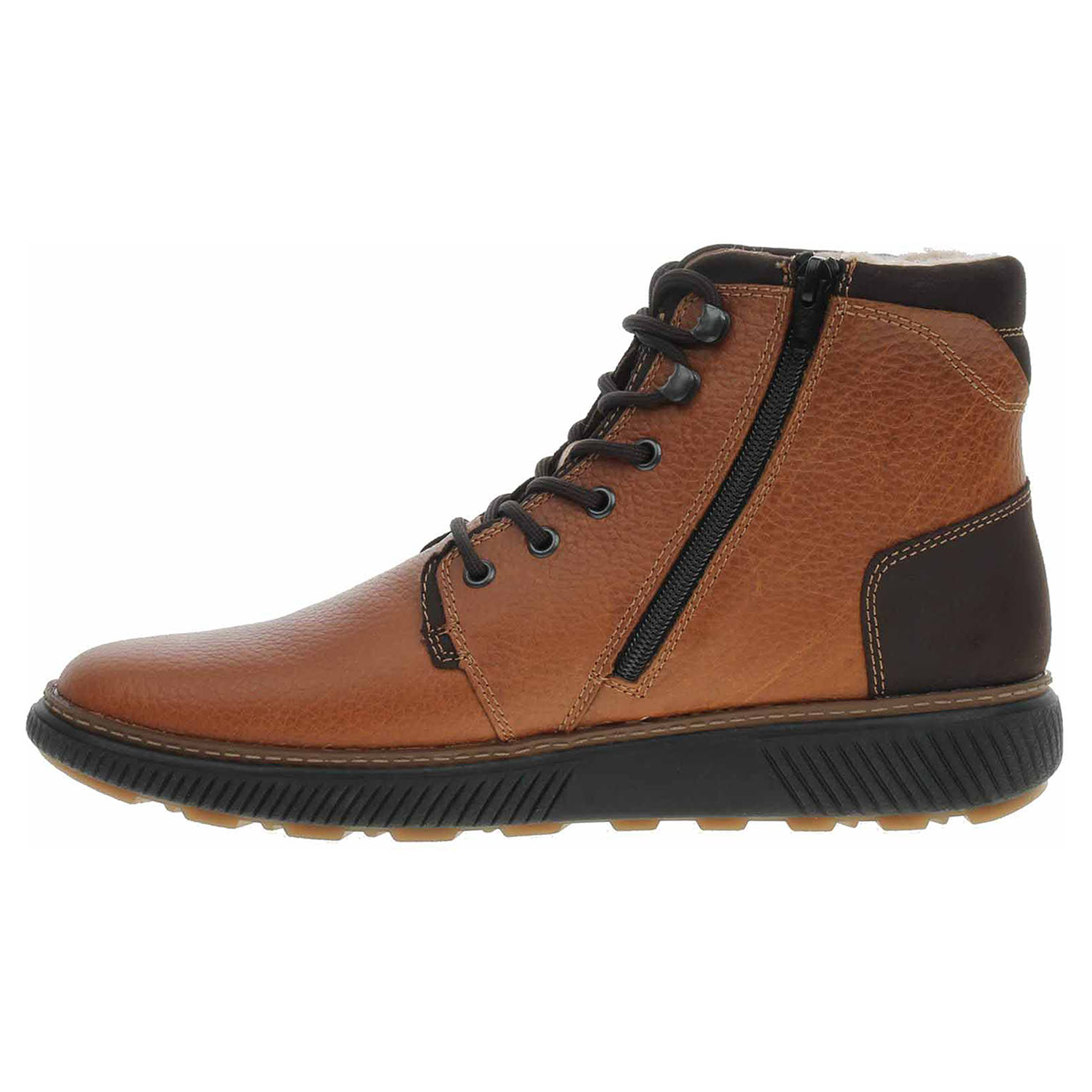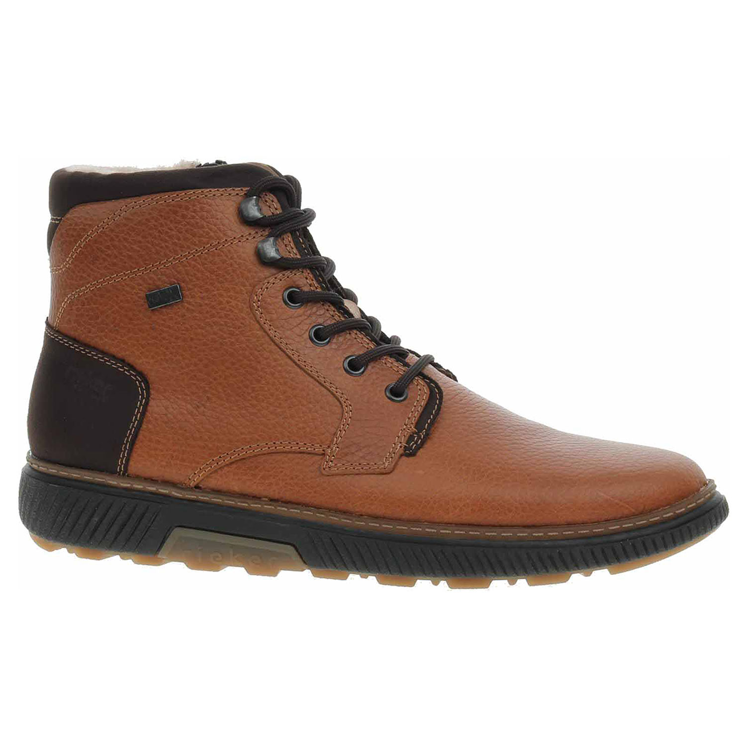 Boty Rieker - lepená pánská kotníková obuv nadměrné šíře se svrškem kombinovaným useň/syntetika a s vypolstrovaným lemem okolo kotníku je vyteplená podšívkou ze střižní ovčí vlny a je vybavená vodoodpudivou membránou RiekerTex a vyndavací stélkou MemoSoft (maximálně změkčuje došlap a zvyšuje pohodlí v obuvi) s textilní nášlapnou vrstvou. Vyměnitelné vložky do bot je možné vyndat za účelem provětrání a omytí. Značnou výhodu nabízejí vyměnitelné vložky do bot také těm uživatelům, kteří používají ortopedické vkládací stélky. Pohodlné nazouvání zajišťuje šněrování na nártu a zip na vnitřní straně. Klínek je vysoký 3,6 cm a platforma je vysoká 2,- cm. Podešev je flexibilní a díky systému Antistress skvěle tlumí nárazy a otřesy. Lepená obuv - pevnost lepeného spoje může být negativně ovlivněna promáčením nebo propocením, event. opakovaným používáním nedostatečně vysušené obuvi. Při neopatrné chůzi může dojít k mechanickému uvolnění lepeného spoje - ukopnutí.