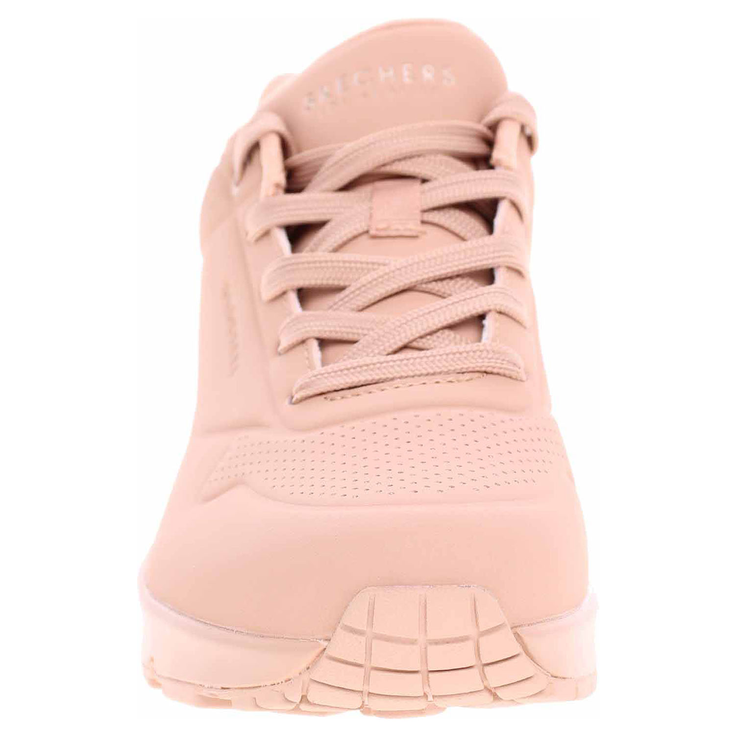Boty Skechers Uno - Stand on Air - lepená dámská vycházková obuv se šněrováním je vybavená paměťovou stélkou Air-Cooled Memory Foam® (vzduchem chlazená pamět.pěna), která zajištuje chůzi jak na polštáři, ale noha se nepřehřívá a přirozeně se ochlazuje. Klínek se vzduchovým polštářem Skech-Air® je vysoký 3,8 cm. Lepená obuv - pevnost lepeného spoje může být negativně ovlivněna promáčením nebo propocením, event. opakovaným používáním nedostatečně vysušené obuvi. Při neopatrné chůzi může dojít k mechanickému uvolnění lepeného spoje - ukopnutí.