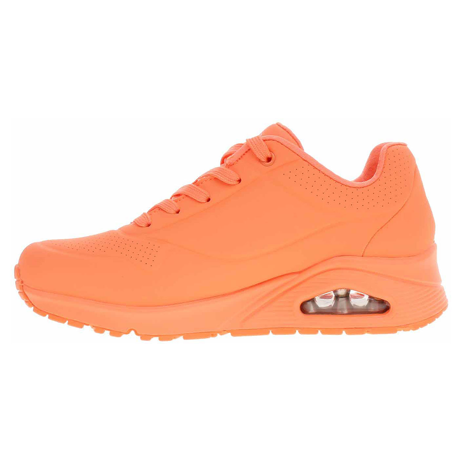 Boty Skechers Street Uno – Night Shades - lepená dámská vycházková obuv se šněrováním má svršek ze syntetiky (durabuck) a je vybavená paměťovou stélkou Air-Cooled Memory Foam. Měkkoučká vzduchem chlazená paměťová pěna zajištuje chůzi jak na polštáři, ale noha se nepřehřívá a přirozeně se ochlazuje. Flexibilní trakční podrážka má klínek se vzduchovým Skech-Air® polštářem vysoký 3,8 cm. Lepená obuv - pevnost lepeného spoje může být negativně ovlivněna promáčením nebo propocením, event. opakovaným používáním nedostatečně vysušené obuvi. Při neopatrné chůzi může dojít k mechanickému uvolnění lepeného spoje - ukopnutí.